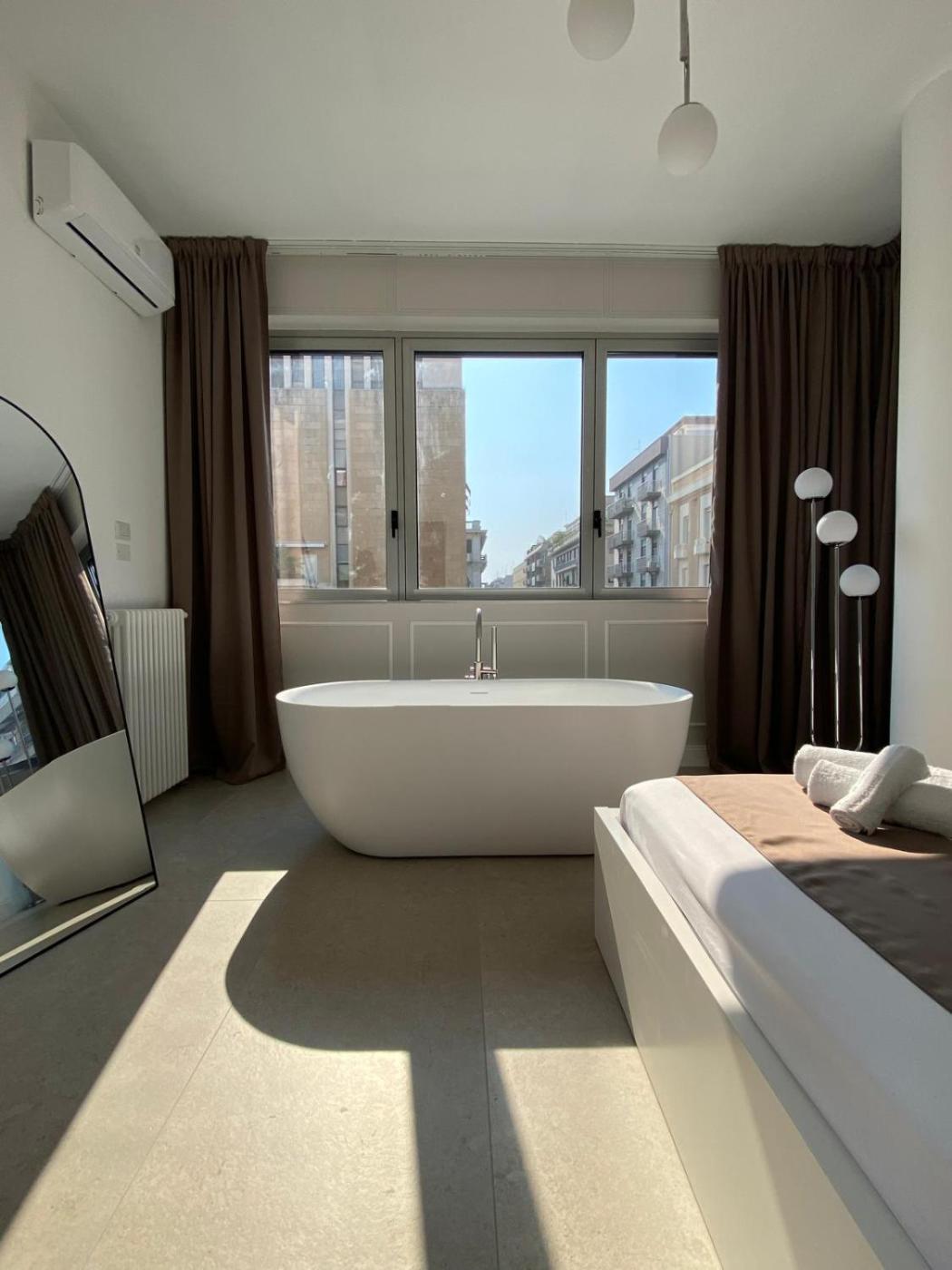 Camera Matrimoniale Deluxe con Vasca. Spaziosa camera matrimoniale climatizzata e insonorizzata, con balcone affacciato sulla città e bagno privato munito di vasca. L’alloggio dispone di 1 letto. ;