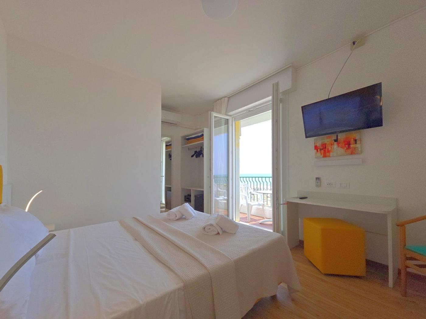 Camera Matrimoniale con Balcone e Vista Mare Laterale. Dotata di balcone arredato e vista parziale sul mare, questa camera climatizzata dispone di TV, minibar e pavimento in laminato. Il bagno privato è completo di asciugacapelli edi cortesia. Le camere includono un ombrellone gratuito e 2 lettini in spiaggia. ;