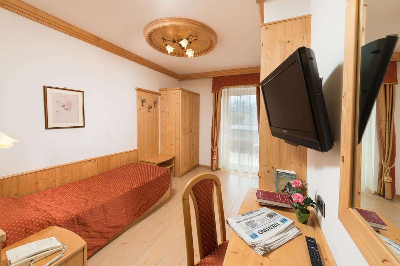 Le camere, decorate con colori caldi nel tipico stile del Trentino, sono dotate di pavimenti in parquet, di una TV a schermo piatto e di un bagno privato con asciugacapelli e articoli da toeletta. Alcune vantano inoltre soffitti con travi in ​​legno a vista o un balcone.