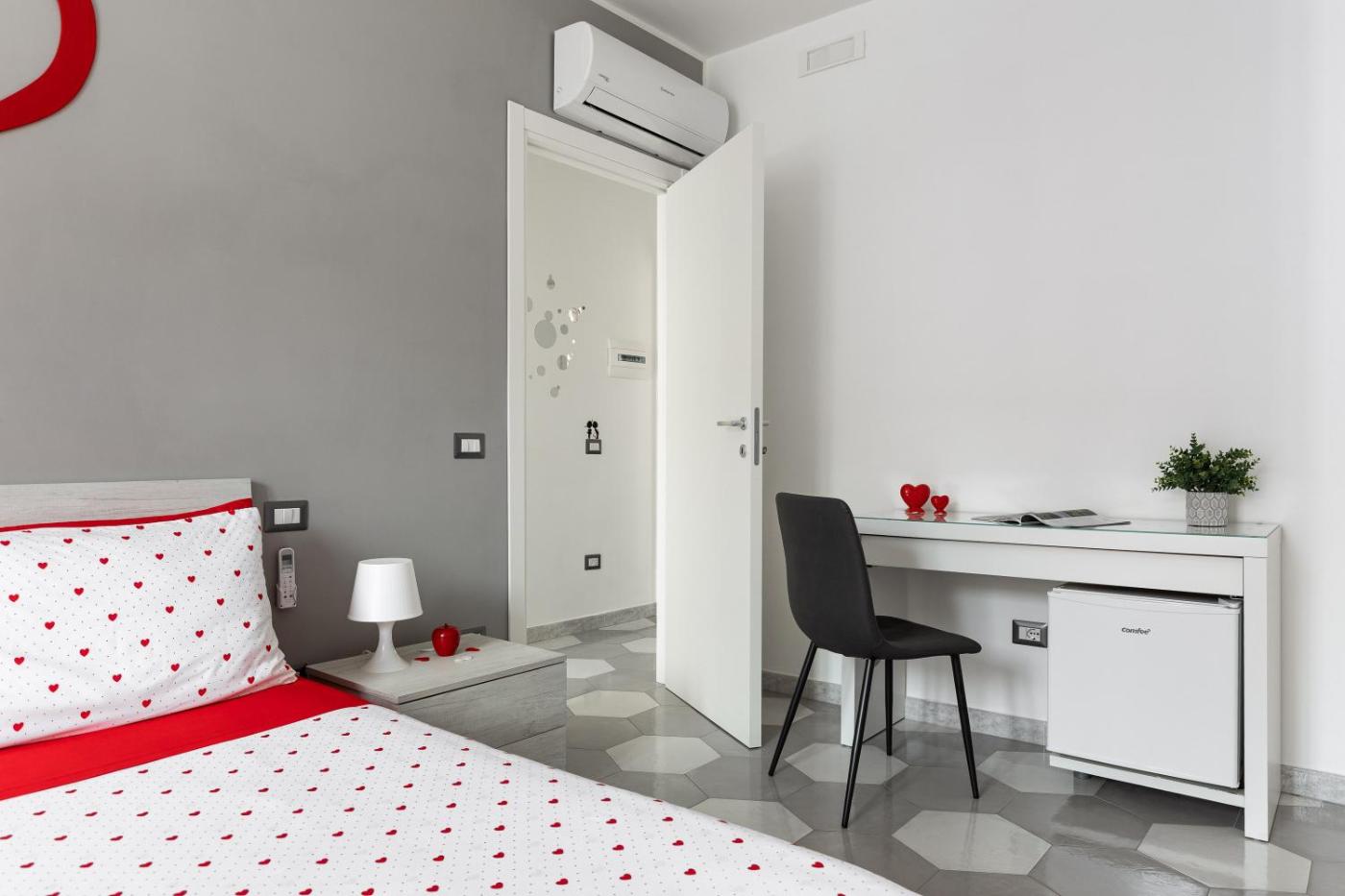 Camera Matrimoniale con Bagno Privato. Camera matrimoniale dotata di bagno privato con doccia, bidet,di cortesia e asciugacapelli. Questa sistemazione matrimoniale dispone di aria condizionata, area salotto con TV a schermo piatto, ingresso privato, pareti insonorizzate, minibar eper la preparazione di tè e caffè. L’alloggio offre 1 letto. ;